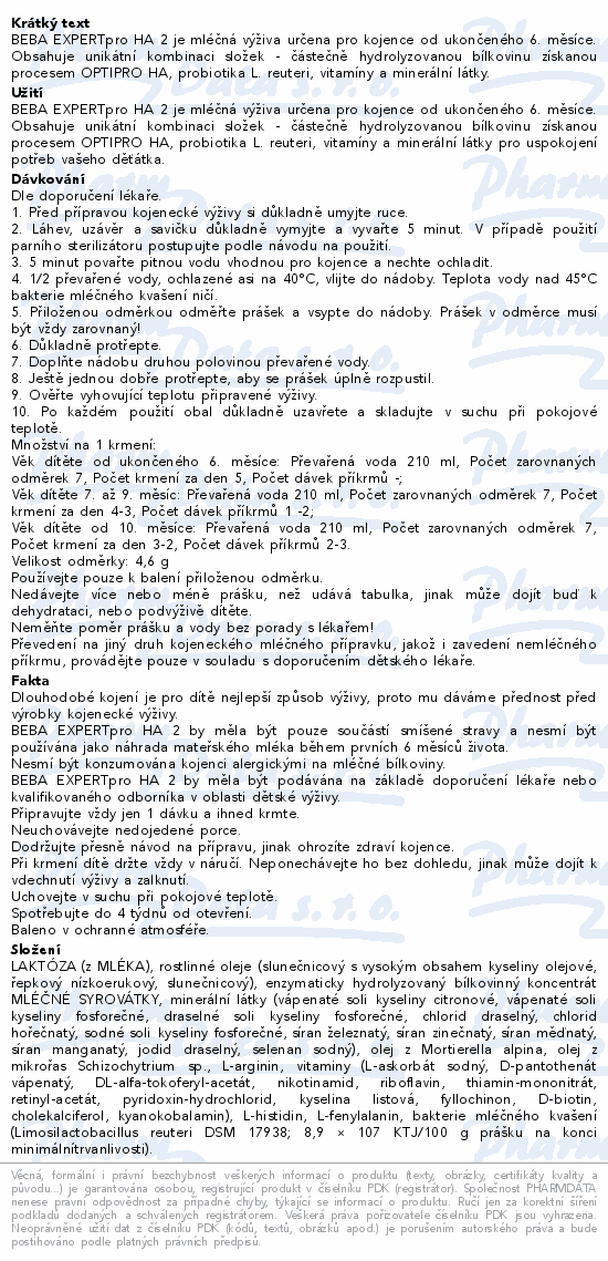 BEBA EXPERTpro HA 2 je mléčná výživa určena pro kojence od ukončeného 6. měsíce. Obsahuje unikátní kombinaci složek - částečně hydrolyzovanou bílkovinu získanou procesem OPTIPRO HA, probiotika L. reuteri, vitamíny a minerální látky.