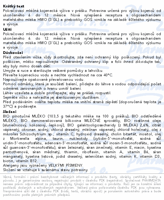 Pokračovací mléčná kojenecká výživa v prášku. Potravina určená pro výživu kojenců od ukončeného 6. do 12. měsíce. Nová vylepšená receptura s oligosacharidem mateřského mléka HMO (3´GL) a prebiotiky GOS vznikla na základě 60letého výzkumu a vývoje.