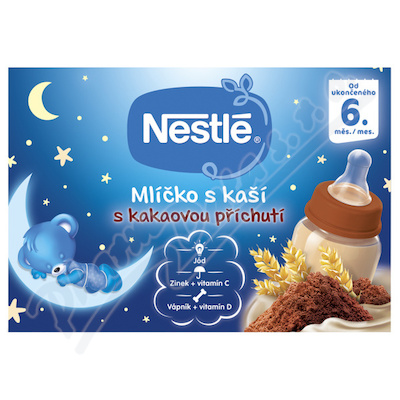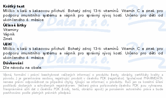 Mlíčko s kaší s kakaovou příchutí. Bohatý zdroj 13-ti vitamínů. Vitamín C a zinek pro podporu imunitního systému a vápník pro správný vývoj kostí. Určeno pro děti od ukončeného 6. měsíce.