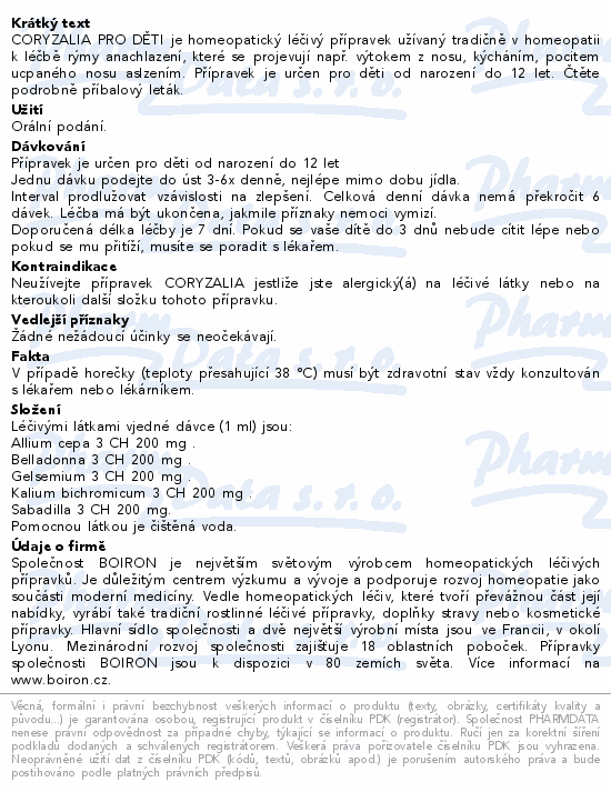 CORYZALIA PRO DĚTI je homeopatický léčivý přípravek užívaný tradičně v homeopatii k léčbě rýmy anachlazení, které se projevují např. výtokem z nosu, kýcháním, pocitem ucpaného nosu aslzením. Přípravek je určen pro děti od narození do 12 let. Čtěte pozorně příbalový leták.