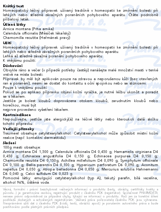 Homeopatický léčivý přípravek užívaný tradičně v homeopatii ke zmírnění bolesti při lehkých nebo středně závažných poraněních pohybového aparátu. Čtěte pozorně příbalový leták.