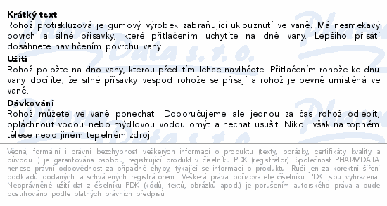 Rohož protiskluzová je gumový výrobek zabraňující uklouznutí ve vaně. Má nesmekavý povrch a silné přísavky, které přitlačením uchytíte na dně vany. Lepšího přisátí dosáhnete navlhčením povrchu vany.