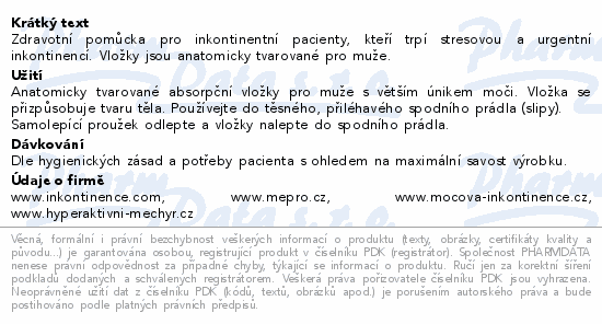 Zdravotní pomůcka pro inkontinentní pacienty, kteří trpí stresovou a urgentní inkontinencí. Vložky jsou anatomicky tvarované pro muže.