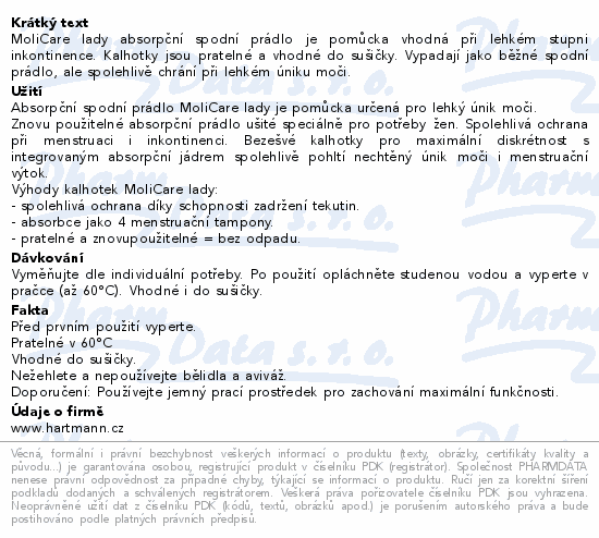 MoliCare lady absorpční spodní prádlo je pomůcka vhodná při lehkém stupni inkontinence. Kalhotky jsou pratelné a vhodné do sušičky. Vypadají jako běžné spodní prádlo, ale spolehlivě chrání při lehkém úniku moči.