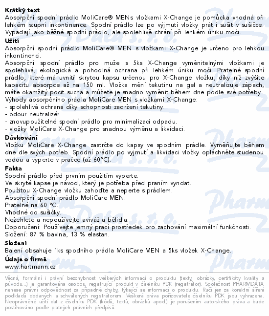 Absorpční spodní prádlo MoliCare® MENs vložkami X-Change je pomůcka vhodná při lehkém stupni inkontinence. Spodní prádlo lze po výjmutí vložky prát i sušit v sušičce. Vypadají jako běžné spodní prádlo, ale spolehlivě chrání při lehkém úniku moči.