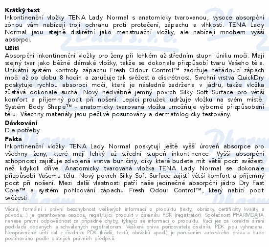 Inkontinenční vložky TENA Lady Normal s anatomicky tvarovanou, vysoce absorpční zónou vám nabízejí TROJÍ OCHRANU proti protečení, zápachu a vlhkosti. TENA Lady Normal jsou stejně diskrétní jako menstruační vložky, ale nabízejí mnohem vyšší absorpci.