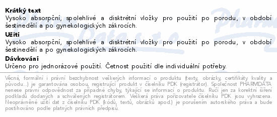 Vysoko absorpční, spolehlivé a disktrétní vložky pro použití po porodu, v období šestinedělí a po gynekologických zákrocích.