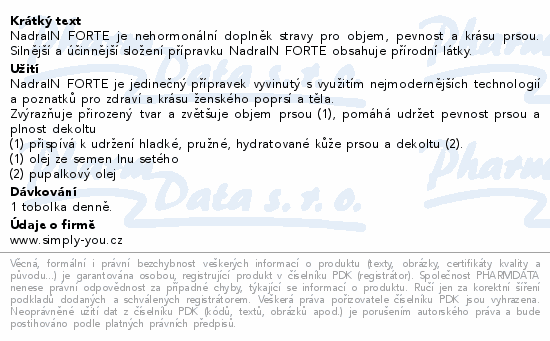 NadraIN FORTE je nehormonální doplněk stravy pro objem, pevnost a krásu prsou. Silnější a účinnější složení přípravku NadraIN FORTE obsahuje přírodní látky.