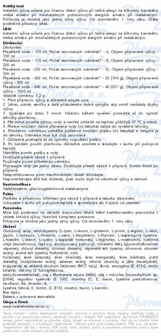 Instantní výživa určená pro řízenou dietní výživu při težké alergii na bílkoviny kravského mléka a/nebo při mnohačetných potravinových alergiích a/nebo při malabsorpci. Potravina je vhodná jako jediný zdroj výživy. Od ukončeného 1. roku věku. Čtěte pozorně příbalový leták.