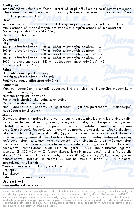 Instantní výživa určená pro řízenou dietní výživu při těžké alergii na bílkoviny kravského mléka a/nebo při mnohačetných potravinových alergiích a/nebo při malabsorpci. Čtěte pozorně příbalový leták.