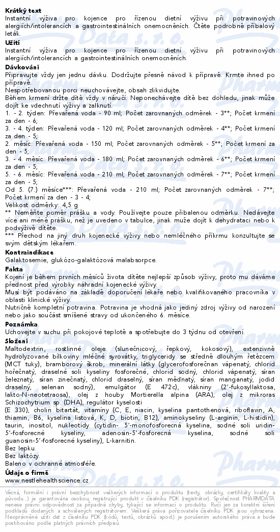 Instantní výživa pro kojence pro řízenou dietní výživu při potravinových alergiích/intolerancích a gastrointestinálních onemocněních. Čtěte pozorně příbalový leták.