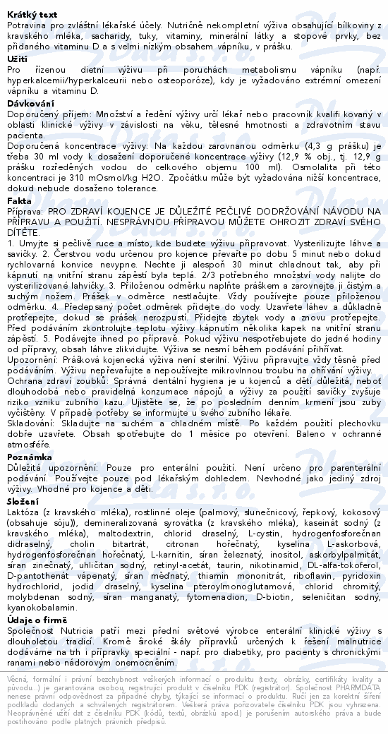 Potravina pro zvláštní lékařské účely. Nutričně nekompletní výživa obsahující bílkoviny z kravského mléka, sacharidy, tuky, vitaminy, minerální látky a stopové prvky, bez přidaného vitaminu D a s velmi nízkým obsahem vápníku, v prášku.