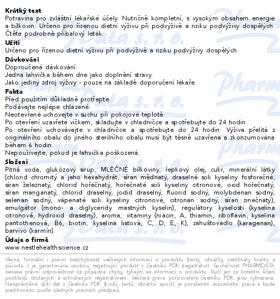 Potravina pro zvláštní lékařské účely. Nutričně kompletní, s vysokým obsahem energie a bílkovin. Určeno pro řízenou dietní výživu při podvýživě a riziku podvýživy dospělých. Čtěte pozorně příbalový leták.