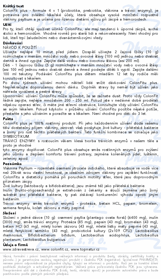 ColonFit plus - formule 4 v 1 (probiotika, prebiotika, vláknina a trávicí enzymy), je potravina pro zvláštní lékařské účely, která obsahuje vysoké množství rozpustné vlákniny psyllium a je určená pro řízenou dietární výživu při zácpě a hemoroidech.