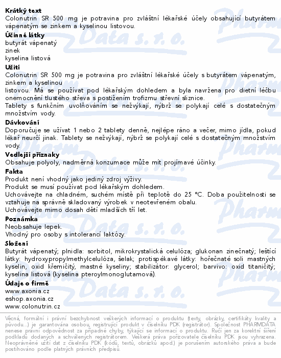 Colonutrin SR 500 mg je potravina pro zvláštní lékařské účely obsahující butyrátem vápenatým se zinkem a kyselinou listovou.