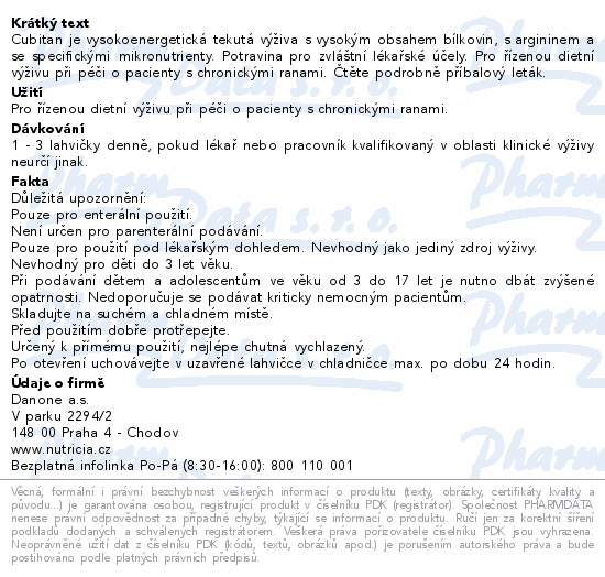 Cubitan je vysokoenergetická tekutá výživa s vysokým obsahem bílkovin, s argininem a se specifickými mikronutrienty. Potravina pro zvláštní lékařské účely. Pro řízenou dietní výživu při péči o pacienty s chronickými ranami. Čtěte pozorně příbalový leták.