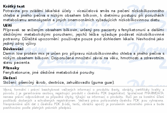 Potravina pro zvláštní lékařské účely - víceúčelová směs na pečení nízkobílkovinného chleba a jiného pečiva s nízkým obsahem bílkovin, k dietnímu postupu při poruchách metabolismu aminokyselin a jiných onemocněních vyžadujících nízkobílkovinnou dietu.