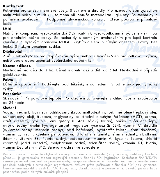 DIBEN DRINK je nutričně kompletní vysokoenergetická výživa určená k popíjení. S vysokým obsahem bílkovin, mononenasycených mastných kyselin, modifikovaných škrobů a fruktózy s nízkým glykemickým indexem a s umělými sladidly. Čtěte pozorně příbalový leták.