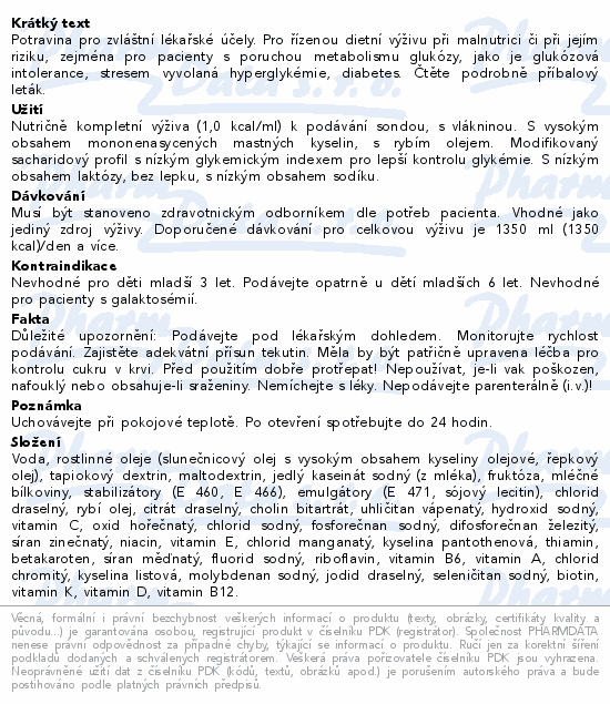 Nutričně kompletní výživa (1,0 kcal/ml) k podávání enterální sondou. S vysokým obsahem mononenasycených mastných kyselin s EPA a DHA z rybího tuku. S modifikovanými sacharidy se škrobem a fruktózou, s nízkým glykemickým indexem. Čtěte pozorně příbalový leták.