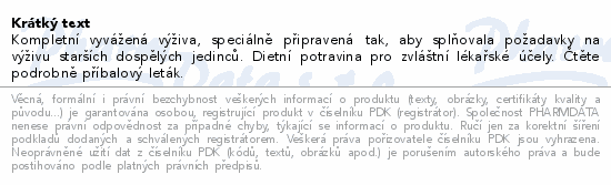 Kompletní vyvážená výživa, speciálně připravená tak, aby splňovala požadavky na výživu starších dospělých jedinců. Dietní potravina pro zvláštní lékařské účely. Čtěte pozorně příbalový leták.