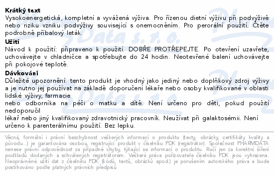 Vysokoenergetická, kompletní a vyvážená výživa. Pro řízenou dietní výživu při podvýživě nebo riziku vzniku podvýživy související s onemocněním. Pro perorální použití. Čtěte pozorně příbalový leták.