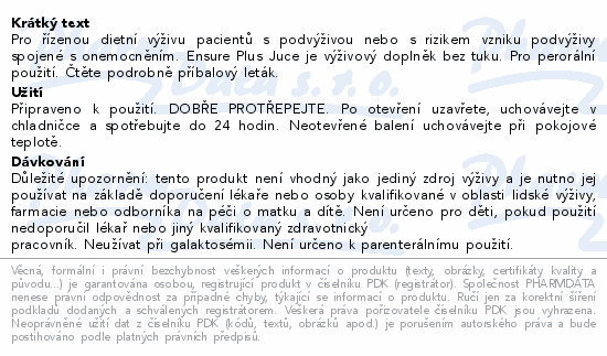Pro řízenou dietní výživu pacientů s podvýživou nebo s rizikem vzniku podvýživy spojené s onemocněním. Ensure Plus Juce je výživový doplněk bez tuku. Pro perorální použití. Čtěte pozorně příbalový leták.