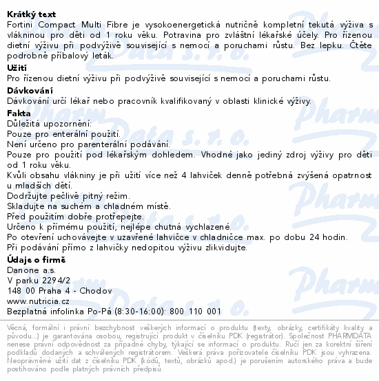 Fortini Compact Multi Fibre je vysokoenergetická nutričně kompletní tekutá výživa s vlákninou pro děti od 1 roku věku. Potravina pro zvláštní lékařské účely. Pro řízenou dietní výživu při podvýživě související s nemocí a poruchami růstu. Bez lepku. Čtěte pozorně příbalový leták.