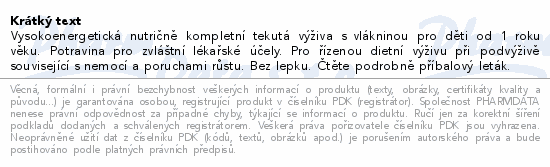 Nutričně kompletní vysokoenergetická tekutá výživa s mléčnou bílkovinou a s vlákninou pro děti od 1 roku věku. Určeno k dietnímu postupu při malnutrici (podvýživě) související s onemocněním a poruchami růstu. S nízkým obsahem laktózy. Bez lepku. Čtěte pozorně příbalový leták.