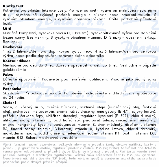 Nutričně kompletní vysokokalorická (2,0 kcal/ml) perorální (k podání ústy) výživa s vysokým obsahem proteinů. Klinicky bez lepku. Příchuť lesní plody. Čtěte pozorně příbalový leták.