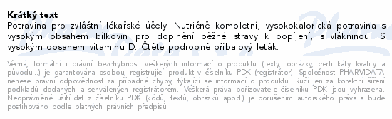 Potravina pro zvláštní lékařské účely. Nutričně kompletní, vysokokalorická potravina s vysokým obsahem bílkovin pro doplnění běžné stravy k popíjení, s vlákninou. S vysokým obsahem vitaminu D. Čtěte pozorně příbalový leták.