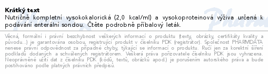 Nutričně kompletní vysokokalorická (2,0 kcal/ml) a vysokoproteinová výživa určená k podávání enterální sondou. Čtěte pozorně příbalový leták.
