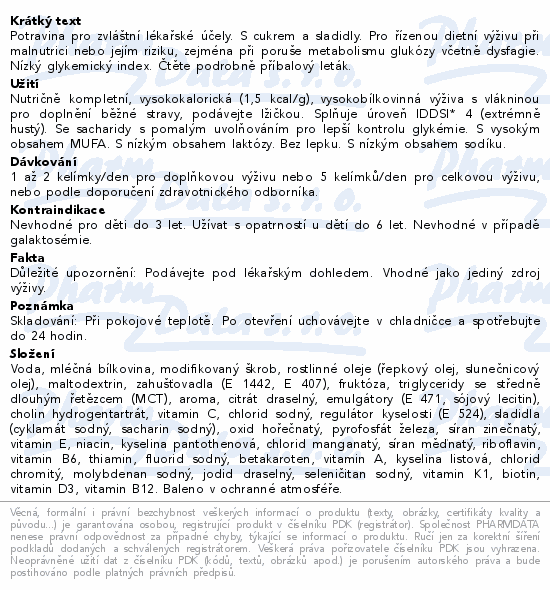Potravina pro zvláštní lékařské účely. Nutričně kompletní, vysokokalorická, s vysokým obsahem bílkovin krémová výživa s vlákninou na doplnění běžné stravy, k podání ústy. Čtěte pozorně příbalový leták.