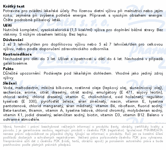 Nutričně kompletní výživa s vysokou energetickou hodnotou 1,5 kcal/ml určená k popíjení. Klinicky bez laktózy a bez lepku. Obsahuje 0,4 mg kofeinu/100 ml. Dietní potravina pro zvláštní lékařské účely. Příchuť: CAPPUCCINO. Čtěte pozorně příbalový leták.