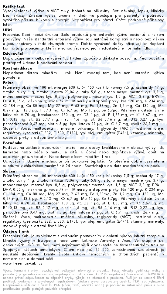 Vysokokalorická výživa s MCT tuky, bohatá na bílkoviny. Bez vlákniny, lepku, klinicky bez laktózy. Zvláštní výživa určená k dietnímu postupu pro pacienty s potřebou vysokého přísunu bílkovin a energie. Nepoužívat pro infuze!. Čtěte pozorně příbalový leták.
