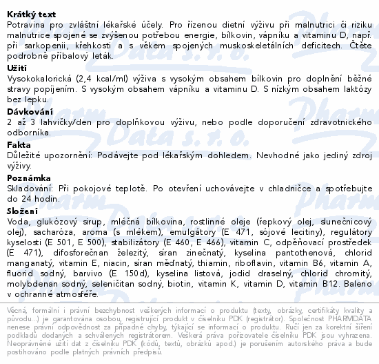 Potravina pro zvláštní lékařské účely. Pro řízenou dietní výživu při malnutrici či při riziku malnutrice, zvýšené potřebě energie, bílkovin, vápníku a vitaminu D, např. např. sarkopenie, křehkosti, nebo s věkem spojené muskuloskeletální deficity. Čtěte pozorně příbalový leták.