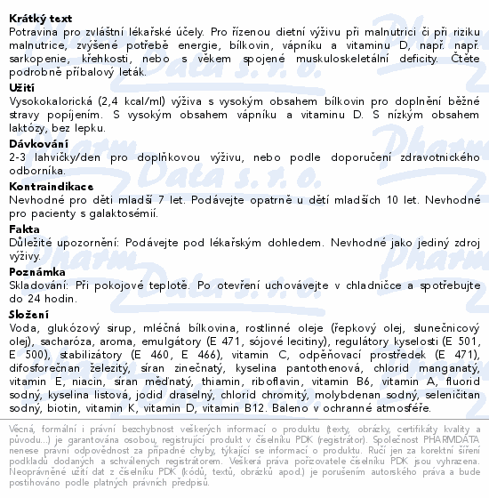 Potravina pro zvláštní lékařské účely. Pro řízenou dietní výživu při malnutrici či při riziku malnutrice, zvýšené potřebě energie, bílkovin, vápníku a vitaminu D, např. např. sarkopenie, křehkosti, nebo s věkem spojené muskuloskeletální deficity. Čtěte pozorně příbalový leták.
