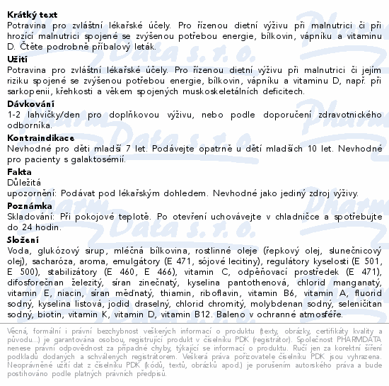 Potravina pro zvláštní lékařské účely. Pro řízenou dietní výživu při malnutrici či při hrozící malnutrici spojené se zvýšenou potřebou energie, bílkovin, vápníku a vitaminu D. Čtěte pozorně příbalový leták.