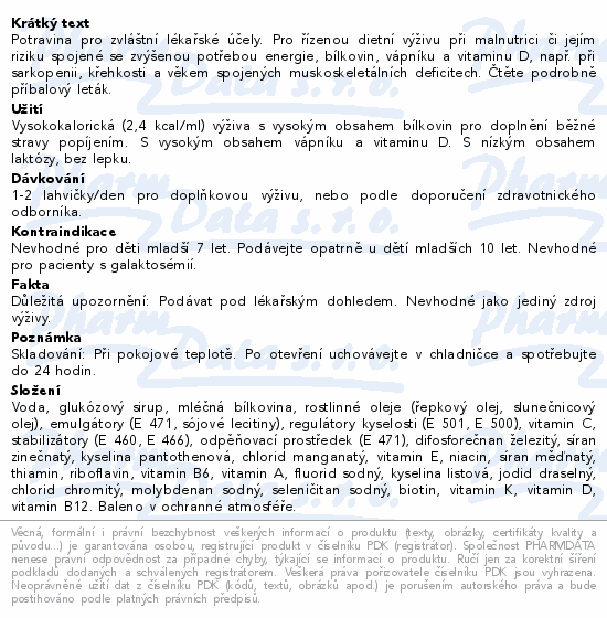 Potravina pro zvláštní lékařské účely. Pro řízenou dietní výživu při malnutrici či při hrozící malnutrici spojené se zvýšenou potřebou energie, bílkovin, vápníku a vitaminu D. Čtěte pozorně příbalový leták.