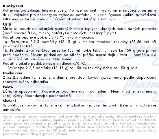 Potravina pro zvláštní lékařské účely. Pro řízenou dietní výživu při malnutrici či při jejím riziku, zejména pro pacienty se zvýšenou potřebou bílkovin. Vysoce kvalitní syrovátková bílkovina ve formě prášku. S nízkým obsahem laktózy a bez lepku.