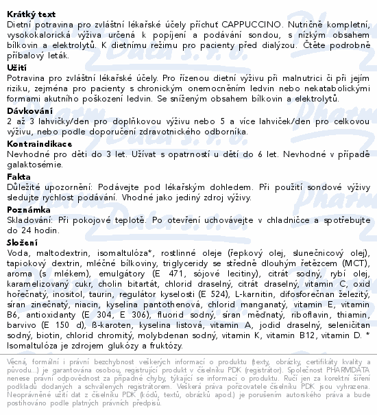 Dietní potravina pro zvláštní lékařské účely příchuť CAPPUCCINO. Nutričně kompletní, vysokokalorická výživa určená k popíjení a podávání sondou, s nízkým obsahem bílkovin a elektrolytů. K dietnímu režimu pro pacienty před dialýzou. Čtěte pozorně příbalový leták.
