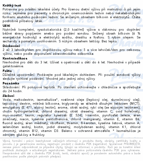 Dietní potravina pro zvláštní lékařské účely - příchuť VANILKA. Nutričně kompletní, vysokokalorická výživa určená k popíjení a podávání sondou, s nízkým obsahem bílkovin a elektrolytů. K dietnímu režimu pro pacienty před dialýzou. Čtěte pozorně příbalový leták.