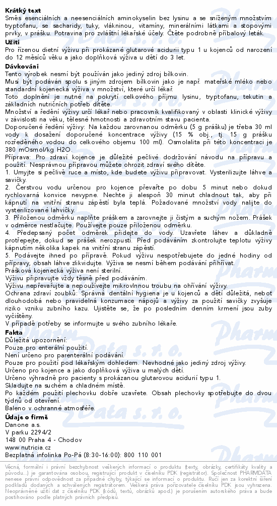 Potravina pro zvláštní lékařské účely. Směs esenciálních a neesenciálních aminokyselin bez lysinu a se sníženým množstvím tryptofanu, se sacharidy, tuky, vlákninou, vitamíny, minerálními látkami a stopovými prvky, v prášku. Čtěte pozorně příbalový leták.