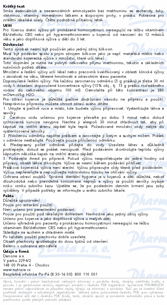 Potravina pro zvláštní lékařské účely. Směs esenciálních a neesenciálních aminokyselin bez methioninu se sacharidy, tuky, vlákninou, vitamíny, minerálními látkami a stopovými prvky, v prášku. Čtěte pozorně příbalový leták.
