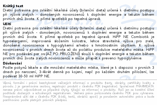 Dietní potravina pro zvláštní lékařské účely (bilanční dieta) určená k dietnímu postupu při výživě zralých - donošených novorozenců k doplnění energie a tekutin během prvních dnů života. K přímé spotřebě po tepelné úpravě.