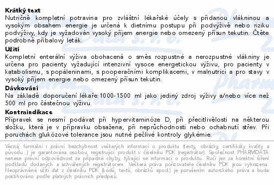 Nutričně kompletní potravina pro zvláštní lékařské účely s přidanou vlákninou a vysokým obsahem energie je určená k dietnímu postupu při podvýživě nebo riziku podvýživy, kdy je vyžadován vysoký příjem energie nebo omezený přísun tekutin. Čtěte pozorně příbalový leták.