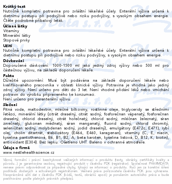 Nutričně kompletní potravina pro zvláštní lékařské účely. Enterální výživa určená k dietnímu postupu při podvýživě nebo riziku podvýživy, s vysokým obsahem energie. Čtěte pozorně příbalový leták.