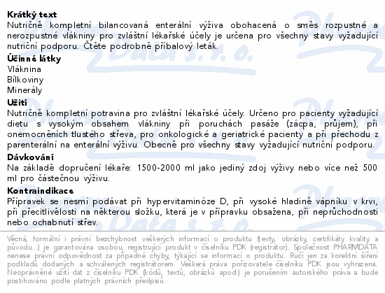 Nutričně kompletní bilancovaná enterální výživa obohacená o směs rozpustné a nerozpustné vlákniny pro zvláštní lékařské účely je určena pro všechny stavy vyžadující nutriční podporu. Čtěte pozorně příbalový leták.