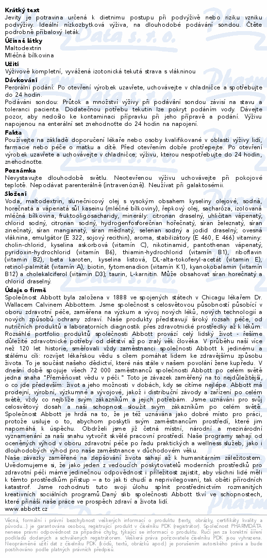 Jevity je potravina určená k dietnimu postupu při podvýživě nebo riziku vzniku podvýživy. Ideální nízkozbytková výživa, na dlouhodobé podávání sondou. Čtěte pozorně příbalový leták.