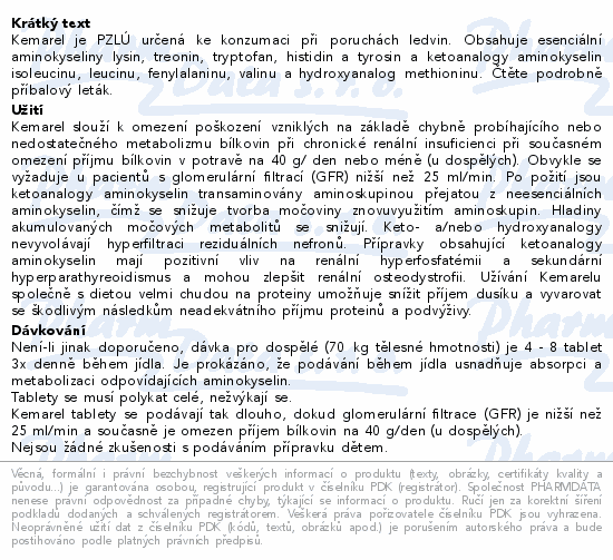 Kemarel je PZLÚ určená ke konzumaci při poruchách ledvin. Obsahuje esenciální aminokyseliny lysin, treonin, tryptofan, histidin a tyrosin a ketoanalogy aminokyselin isoleucinu, leucinu, fenylalaninu, valinu a hydroxyanalog methioninu. Čtěte pozorně příbalový leták.
