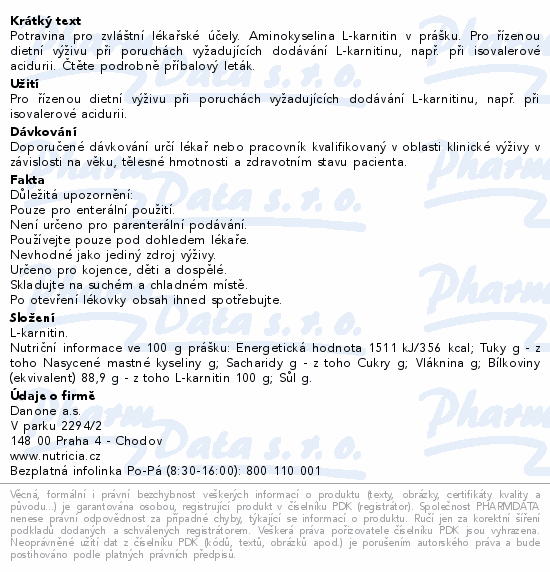 Dietní potravina pro zvláštní lékařské účely Aminokyselina L-karnitin v prášku. Určeno k dietnímu postupu při poruchách vyžadujících dodání L-karnitinu, např. při isovalerové acidurii. Čtěte pozorně příbalový leták.